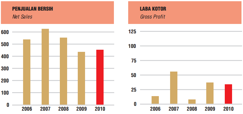 Laba Kotor turun dari Rp 38 miliar menjadi Rp 29 miliar terutama - karena naiknya harga Bahan Baku dan pos-pos biaya produksi tetap turut naik mengikuti naiknya volume produksi dan penjualan sehingga mendapatkan Rugi Usaha Rp 7 miliar. Beban Usaha dapat ditekan. Namun Beban Lain-lain naik terutama karena laba selisih kurs sebesar Rp 11 miliar akibat menguatnya Rupiah di akhir tahun, dan tidak ada Sanksi Administrasi Pajak (SKPKB). Perseroan memperoleh Laba Bersih sebesar Rp 9,9 miliar di tahun 2010.